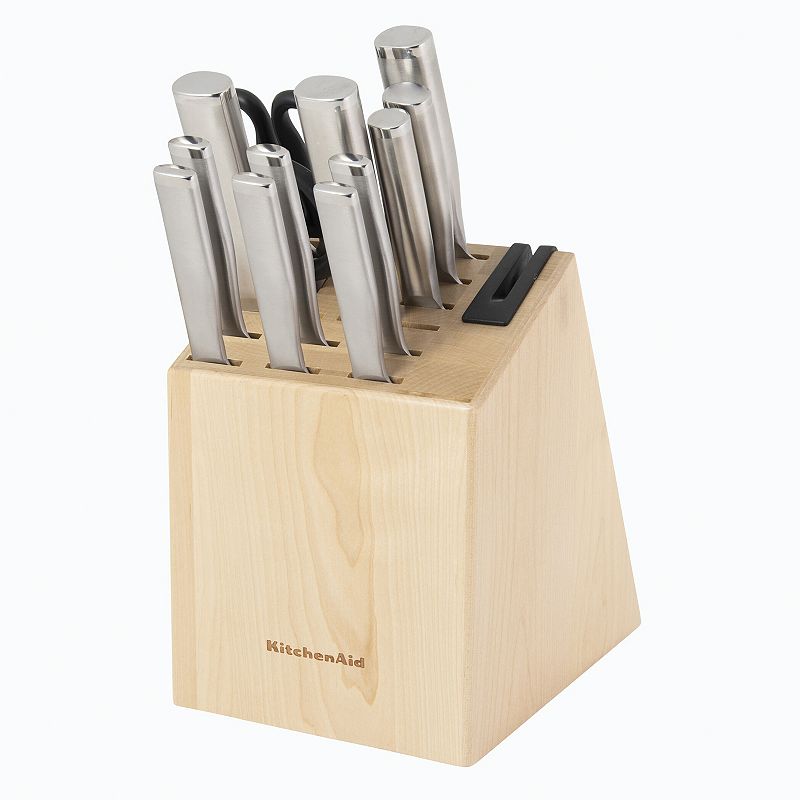 KitchenAid Gourmet Forged Knife Block Set with Built-in Knife Sharpener, BlackThis KitchenAid Gourmet 14-piece forged cutlery set includes all the essential knives needed to perform everyday food prep tasks such as slicing, cutting, chopping, mincing, trimming and more. This KitchenAid Gourmet 14-piece forged cutlery set includes all the essential knives needed to perform everyday food prep taskKitchenAid