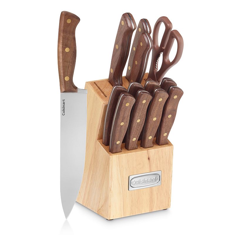 Cuisinart 14-pc. Triple Rivet Knife Block Set, BrownChop veggies, slice bread and cut through meat with this Cuisinart knife block set. High-carbon stainless steel blades ensure precision and accuracy.Precision-tapered blades feature the exceptionally sharp edges recommended by experts for safer, more precise slicing and cutting. Triple-riveted handle provides a secureCuisinart