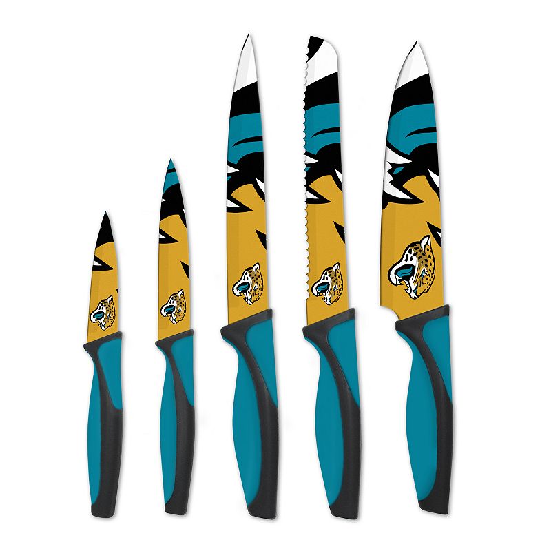 Jacksonville Jaguars 5-Piece Cutlery Knife Set, TeamCut like a boss in the kitchen with this Jacksonville Jaguars cutlery knife set.PRODUCT FEATURESNon-slip ergonomic handlesOfficially licensedWHAT'S INCLUDEDChef knifeBread knifeCarving knifeUtility knifeParing knifeStainless steelHand washImportedShop our full assortment of Jacksonville Jaguars items here. When you?reNFL