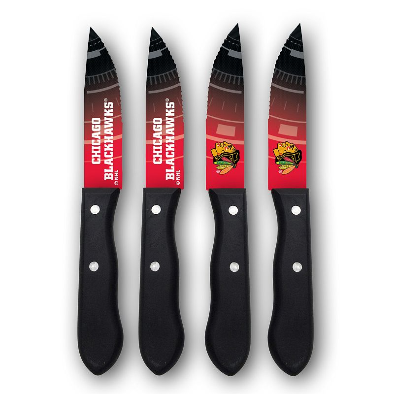 Chicago Blackhawks 4-Piece Steak Knife Set, TeamSlice through your favorite cute of meat like a champ with these Chicago Blackhawks steak knives.PRODUCT FEATURESIncludes 4 steak knivesSerrated bladesHalf-tang blade designErgonomic handlesOfficially licensedStainless steelHand washImportedShop our full assortment of Chicago Blackhawks items here. When youre a fan, yoNHL
