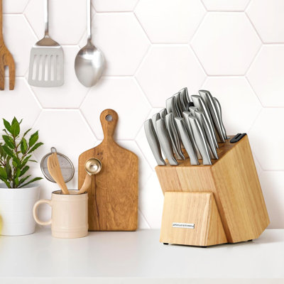 Zulay Kitchen Premium 18-Piece Knife Set with Natural Wood Block and Built-in SharpenerOur premium stainless steel knife block set offers exceptional sharpness, durability, and rust resistance. Precision-forged for long-lasting performance, this comprehensive set includes essential kitchen tools like a versatile chef's knife, santoku knives, a bread knife, a carving knife, eight steak knives, and kitchenZulay Kitchen