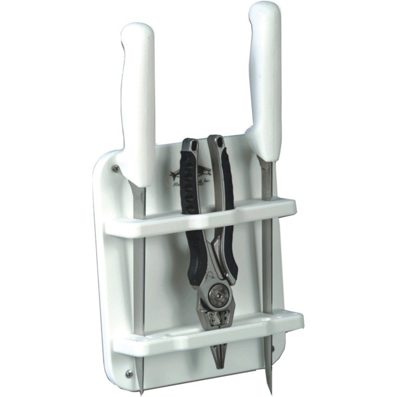Marine Raider Knife and Plier Holder Caddy White - Marine AccessoriesStore your gear in the Marine Raider Knife and Plier Holder Caddy. The polypropylene construction provides sturdiness, and the corrosion-proof coating resists the elements. It can be installed with suction cups or screws depending on what you prefer. The caddy holds 1 set of pliers with carabiner, 2 knives and 13 hooksMarine Raider
