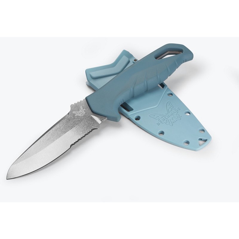 Benchmade Undercurrent Fixed Fishing Knife Blue - Fixed Blade KnivesThe Benchmade Undercurrent Fixed Fishing Knife features a 4.32-inch fixed, serrated curved blade made from corrosion-resistant stainless steel for cutting lines, ropes and bait. The Santroprene handle is durable and provides a secure grip in wet conditions, and a molded sheath is included to protect the knife's blade wBenchmade