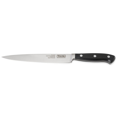 Viking Professional 8" Carving KnifeDesigned in Germany, Viking Culinary Professional Carving Knife delivers uncompromising performance due to the exceptional balance between the blade and handle. This fully forged knife is constructed with an integrated tang and riveted POM handle. Forged from high-alloy steel to ensure sharpness, deliver edge retentionViking