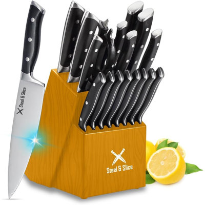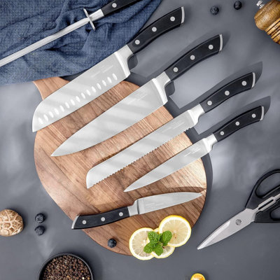 Wuyi 8 Piece Stainless Steel Knife Block Set8-inch Chef's Knife, 7-inch Santoku Knife, 8-inch Serrated Bread Knife, 6-inch Utility Knife, 4-inch Paring Knife, 8-inch Sharpener Steel, 1 PC stainless steel Shears, and a 1 PC sleek Wooden Block. wuyiwuyi