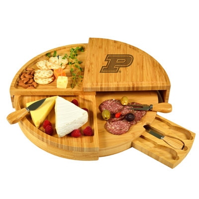 NCAA Purdue Boilermakers Bamboo Charcuterie Board With Knife Set-Stores As A Compact Wedge-Opens To 18" DiameterA great alumni gift, theVienna Bamboo Charcuterie set swivels from an easy to store 9.5" wedge to a substantial 18" diameter, circular, multi level, cheese board withpull out cheese tool drawer. Theingenious design provides support to all levels when completely open, will impress guests when entertaining. Dimensions -Picnic at Ascot