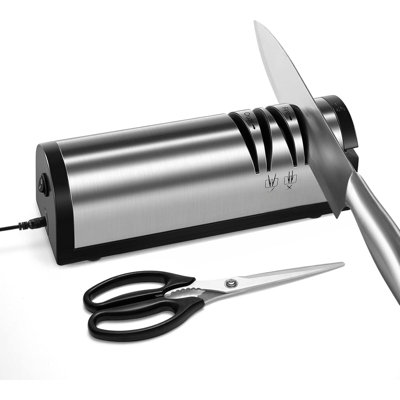 Professional 2 Stage Electric Knife Sharpener, With Scissors Sharpener And Metal Dust Collection BoxElectric Knife Sharpener is designed for home & kitchen use, bringing you professional results at home. It is more convenient and faster than manual sharpeners. It works on several kinds of straight-blade knives like chef knives, slicing knives, and santoku knives but not ceramic. 3 in 1 Multifunctional Knife SharpenerGO APPLIANCE CENTRAL, LLC