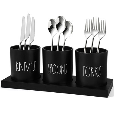 Silverware Caddy, 4 Pieces Kitchen Utensil Holder For Countertop, Black Utensil Holder For Party, Silverware Holder For Party With Wood TrayThe silverware caddy features a beautiful, classic design with 3 pieces of glass silverware holder with a wooden tray, 4 pieces in total to keep your cookware cutlery or other kitchen essentials separated and organized; The kitchen utensil holder for countertop is easy to move around the countertop, kitchen table, or dHokku Designs