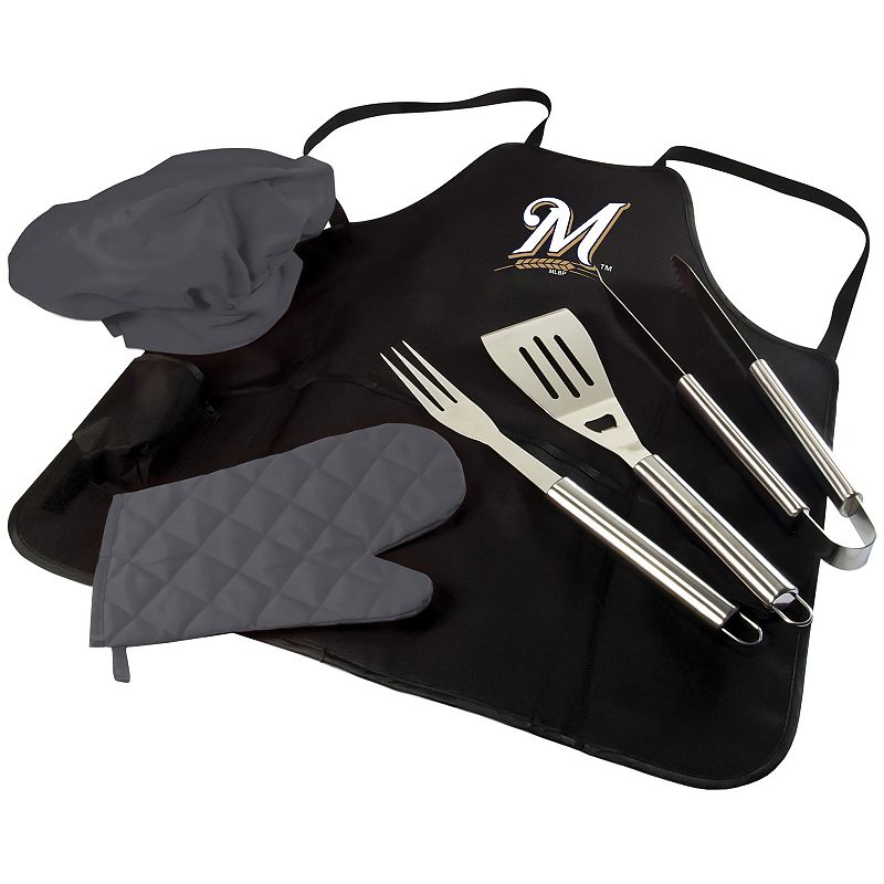 Picnic Time Milwaukee Brewers BBQ Apron, Utensil & Tote Set, BlackYou'll be a BBQ master on game day or any day with this Milwaukee Brewers apron and utensil set from Picnic Time.PRODUCT FEATURES Team logo graphic Includes: apron, spatula, fork, tongs, chef's hat & oven mitt Apron folds into a carrying tote Polyester, stainless steel Wipe clean Imported Shop our full assortment of MiPicnic Time