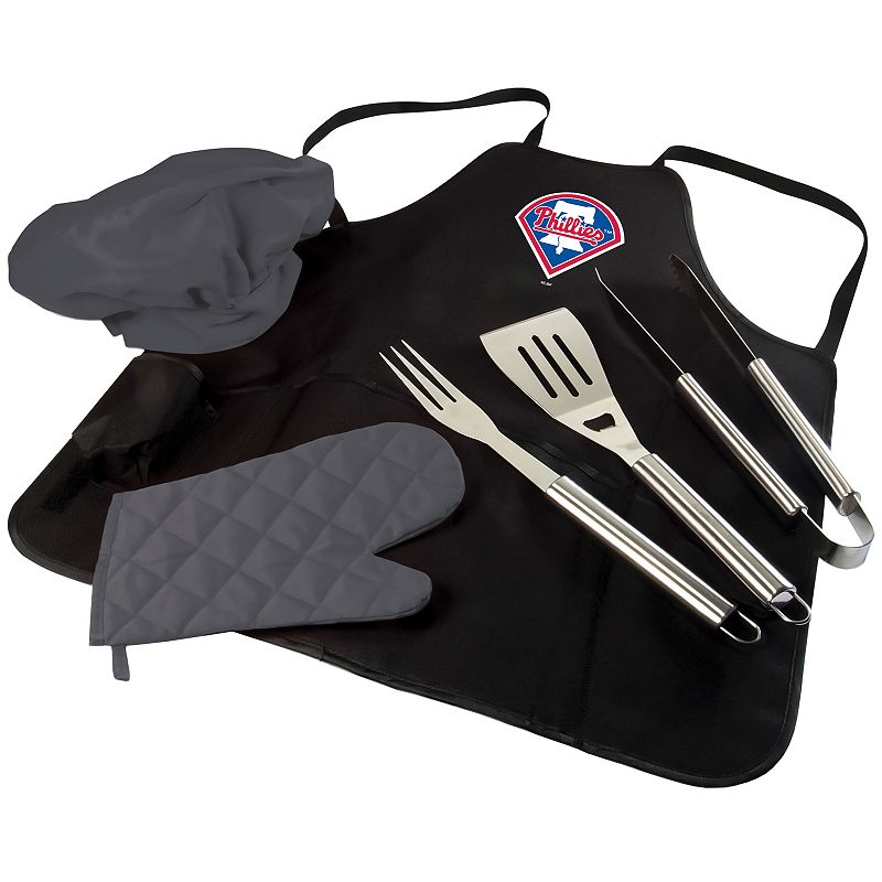 Picnic Time Philadelphia Phillies BBQ Apron, Utensil & Tote Set, BlackYou'll be a BBQ master on game day or any day with this Philadelphia Phillies apron and utensil set from Picnic Time.PRODUCT FEATURES Team logo graphic Includes: apron, spatula, fork, tongs, chef's hat & oven mitt Apron folds into a carrying tote Polyester, stainless steel Wipe clean Imported Shop our full assortment oPicnic Time