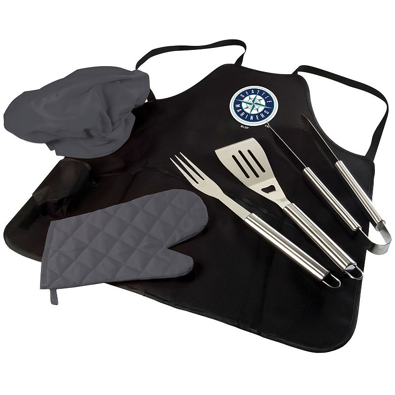 Picnic Time Seattle Mariners BBQ Apron, Utensil & Tote Set, BlackYou'll be a BBQ master on game day or any day with this Seattle Mariners apron and utensil set from Picnic Time.PRODUCT FEATURES Team logo graphic Includes: apron, spatula, fork, tongs, chef's hat & oven mitt Apron folds into a carrying tote Polyester, stainless steel Wipe clean Imported Shop our full assortment of SeaPicnic Time
