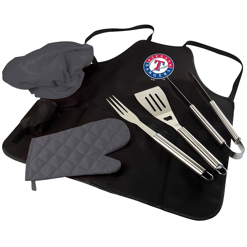 Picnic Time Texas Rangers BBQ Apron, Utensil & Tote Set, BlackYou'll be a BBQ master on game day or any day with this Texas Rangers apron and utensil set from Picnic Time.PRODUCT FEATURES Team logo graphic Includes: apron, spatula, fork, tongs, chef's hat & oven mitt Apron folds into a carrying tote Polyester, stainless steel Wipe clean Imported Shop our full assortment of TexasPicnic Time