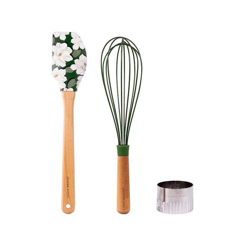 DRAPER JAMES RSVP™ Baking Utensil Set - Magnolia GreenUpgrade your utensil lineup with this DRAPER JAMES RSVP charming set of utensils. Upgrade your utensil lineup with this DRAPER JAMES RSVP charming set of utensils. FEATURES Food safe Dishwasher safe Metal biscuit cutter measures 2.5" wide Spatula and whisk are made of silicone with wooden handlesWHAT'S INCLUDED SpatulaDRAPER JAMES RSVP