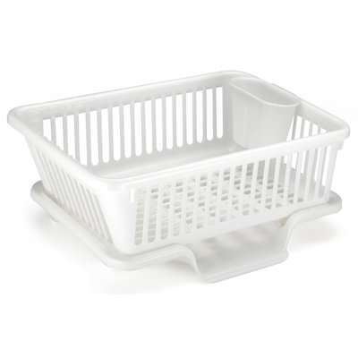 • Heavy Duty 2-Piece Plastic Dish Drying Rack Set in White - Includes Large Dish Drainer, Attached Drainboard, and Utensil Cup Holders for Home KitchenThis white large dish drying rack features distinct compartments for cutlery and flatware, accommodating various dish sizes while conveniently sitting over the sink. The flatware holder includes drain holes to prevent water accumulation, and the removable drain board with a specially designed hole allows excess water t