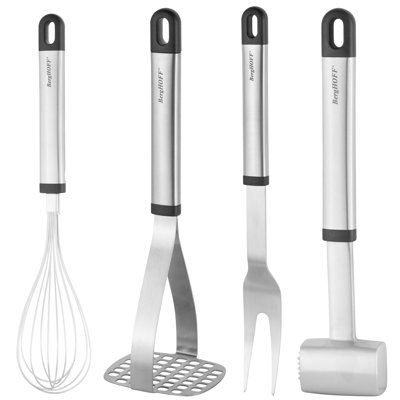 • BergHOFF 4 Piece Essentials Prep Kitchen Utensil SetThis set includes 1 meat hammer, 1 whisk, 1 meat fork, 1 potato masher. The durable stainless steel is sure to stand the test of time and add a classic look to any kitchen dcor. BergHOFF
