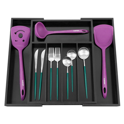 Bamboo Drawer Organizer - Kitchen Utensil Organizer Silverware Tray Cutlery Holder,Office Desk Supplies And Accessories,12 * 5.9 * 2.6,BlackThis cutlery organizer is made of bamboo and it has a neutral light wood color and it looks beautiful as your kitchen, closet, garage and office drawer. Growing quickly and sustainably, bamboo is a hardy material that can be used as a household item in tables, bedside tables, display stands, living rooms, bedrooms, kitPrep & Savour