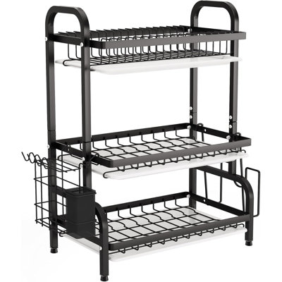 Drying Rack, Metal 3-Tier Large Capacity Dish Rack With Utensil Holder, Cutting Board Holder, Drain Board Tray For Kitchen Counter Storage BlackThe 3 tier dish drying rack can hold more tableware than the traditional 1 or 2 tier ones. Which includes 1 dish rack, 1 Utensil Holder, 1 knife and cutlery holder, 1 cutting board holder, and 3 Removable Drain Board. On the third tier, it can put about 17 plates, and the other two tiers to put bowls, cups, pans, pots,RIVERCITY CUSTOM CABINETRY, INC.