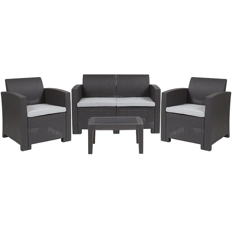 Flash Furniture Patio Chair, Loveseat & Coffee Table 4-piece Set, Dark GrayTransform your outdoor entertainment space with this beautiful Flash Furniture lounge set. Transform your outdoor entertainment space with this beautiful Flash Furniture lounge set. Faux rattan design All-weather construction Removable cushions included For outdoor use One loveseat: 30"H x 47"W x 27"D Two arm chairs: 3Flash Furniture