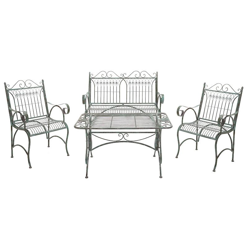 Safavieh Leah Patio Loveseat, Coffee Table, & Chair 4-piece Set, Antique Dark GreenLiven up your outdoor decor with this stylish Safavieh Leah Patio Loveseat, Coffee Table, & Chair 4-piece Set. Liven up your outdoor decor with this stylish Safavieh Leah Patio Loveseat, Coffee Table, & Chair 4-piece Set. Scroll details For outdoor useDETAILS Seat height: 17-in. Table: 22"H x 39.2"W x 23.5"D Bench: 38"Safavieh