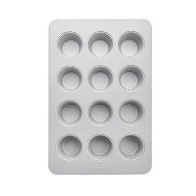 KitchenAid Nonstick Aluminized Steel Muffin Pan, 12-Cup, SilverThis 12-cup muffin pan is essential for making delicious muffins, cupcakes, quick breads, mini quiches, and more. The pan is designed with extended handles, which provide a secure grip when lifting in and out of the oven, even when using thick and bulky oven mitts. The pan is made from durable, heavy-duty aluminized stKitchenAid