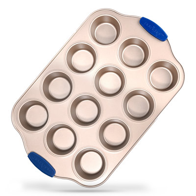 12 Cup Muffin Pan - Deluxe Nonstick Gold Coating Inside & Outside With Blue Silicone Handles, Compatible With Models: NCSBSG78, NCSBSG60, NCSBSG36 (Go16 12 cup muffin nonstick baking pan, deluxe gold carbon steel bake pan with blue silicone handles, commercial-grade restaurant quality metal bakeware, compatible with model ncsbsg78 NutriChefNutriChef