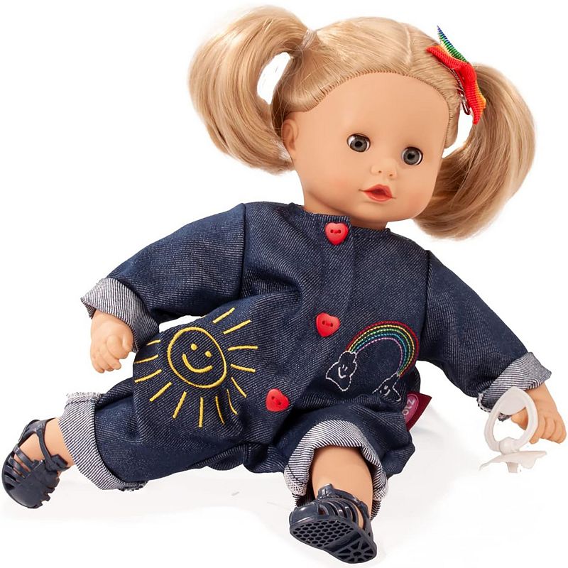 Gotz Muffin Rainbow 13" Soft Baby Doll with Denim Jumpsuit and Blonde Hair to Wash & Style, MultiReinvent your little one's playtime and let them discover a world of possibilities with this Gotz Muffin Rainbow 13" Soft Baby Doll with Denim Jumpsuit and Blonde Hair to Wash & Style. FEATURES Muffin wears a pink shirt with puffed sleeves and cherry print, adorable blue pants with ruffled trim and comfy blue rubber saGotz