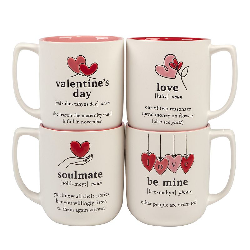 Certified International Valentines Day Set of 4 Mugs, MultiCertified International's "Valentine's Day Fun" set of 4 mugs designed by Courtney Morgenstern is a delightful addition to any Valentine's Day celebration. With their fun sayings and playful design featuring hanging hearts and heart shaped flowers, they are sure to bring joy to your table. Certified International's "VaCertified International