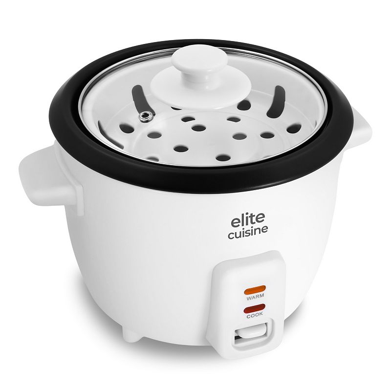 Elite Cuisine 6-Cup Non-Stick Rice Cooker with Steam Tray, WhitePrepare ideal, fluffy rice with the Elite Cuisine Deluxe 6-Cup Rice Cooker with Steam Tray. Cook up to 6 cups of rice (using 3 cups uncooked) while simultaneously steaming vegetables or fish. This cooker takes the guesswork out of boiling water and watching pots, automatically switching to "Keep Warm" once cooking is cElite
