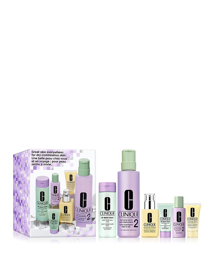 Clinique Great Skin Everywhere Skincare Set - Dry Skin Types ($118 value) - Size - OSWhat It Is:Clinique's signature 3-Step System for healthy-looking skin. One set for home, one for travel. Customized for drier skin types. Dermatologist developed. Allergy tested.Set Includes:- All About Clean Liquid Facial Soap Mild 6.7 oz.- Clarifying Face Lotion 2 Twice a Day Exfoliator 16.5 oz.- Dramatically DifferClinique