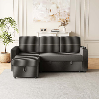 Corduroy Sofa Bed, 3 Seater Sleeper Sofa With Storage Chaise, Square Handrail With Two Cup-Holder And USB Charge Port, Pull Out Couch For Living RoomIntroducing the ultimate 3 Seater Sleeper Sofa with Storage Chaisea delightful fusion of comfort, functionality, and space efficiency. This cozy pull-out bed transforms any room into a guest haven in seconds, while the firm, solid frame ensures years of durable use. Immerse your guests in a warm embrace with our LargeLatitude Run
