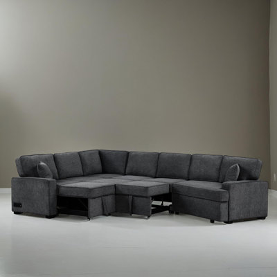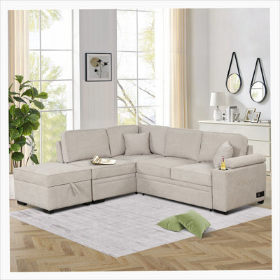 126" Wide L-Shaped Pull Out Sleeper Sectional Sofa Bed With USB PortsTransform the L-shaped sofa into a cozy bed effortlessly with the assistant of handle straps and smooth wheels, whether it's for overnight guests to sleep or for your leisure and relaxation, it can easily meet your requirements. This convertible sofa comes with two drop-down tables with cup holders under the backrests,Latitude Run