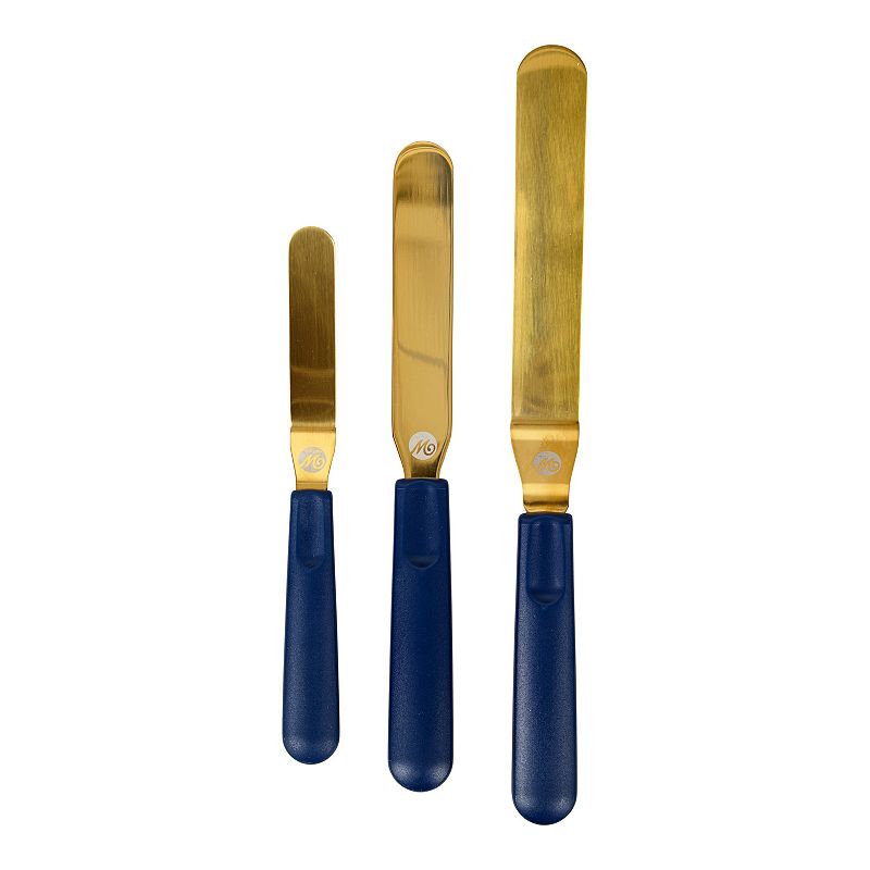 Wilton Navy Blue & Gold 3-pc. Icing Spatula Set, MultiIt's time to upgrade your cake decorating spatulas to a beautiful set that looks great and just makes you happy every time you use it. This navy blue and gold Wilton spatula set is not only gorgeous, but it performs just as well. The stainless steel blades are sturdy for years of use and the angled handles keep your fiWilton