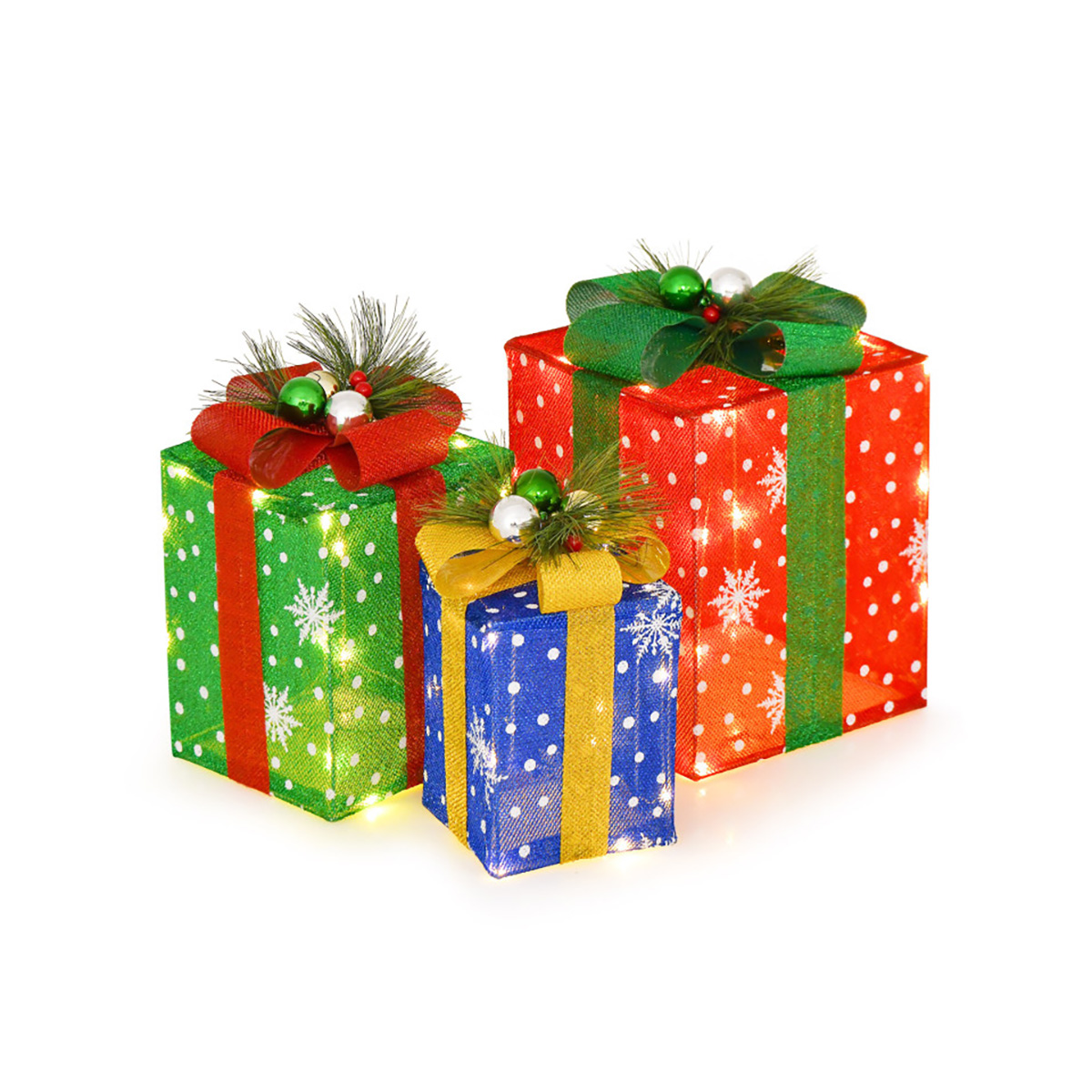 Pre-Lit Christmas Gift Box Decoration (Set of 3)Includes 3 gift box decorations in vibrant colors52 warm LED lights for a festive holiday glowDurable tinsel fabric and metal frame for lasting qualityEasy, pre-assembled setup with hook-and-loop fastenersSuitable for indoor and outdoor use Pre-Lit Christmas Gift Box Decoration (Set of 3)GoPlus Costway