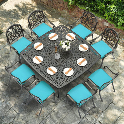Vivijason 9-piece Outdoor Furniture Dining Set For 8, All-weather Cast Aluminum Patio Table And Chairs Set With 8 Cushioned Chairs, 63.98" Large SquarElevate your outdoor dining experience with this elegant 9-piece cast aluminum dining set. The spacious 63.98-inch square table, paired with 8 intricately designed chairs, provides ample room for family and friends. Crafted from all-weather cast aluminum, this patio furniture set will provide years of service for familVIVIJASON