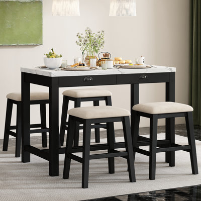 5 Pcs Bar Table Set Dining Table & 2 Linen Fabric, 5 Piece Dining Set, Padded Bar Stools Faux MarbleThe simple yet elegant construction of the 5-piece bar table set offers a versatile aesthetic, making it a great choice for a variety of interior styles, from cozy home kitchens to stylish urban apartments. The faux marble sticker tabletop is scratch and stain resistant, making it a practical choice for home and frequeLark Manor