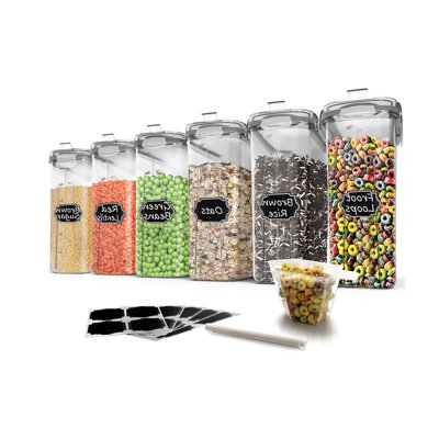 Cereal Storage Containers Set, 6 Piece Set Cereal Dispensers With 20 Labels And Marker, GreyEach cereal storage container has a large capacity of 4L/135.3oz, perfect for storing flour, sugar, rice, nuts, beans, cereal, snacks, pet food, or anything else you may need to store. With comfortable ergonomic grips, you can hold these cereal containers effortlessly even its fullYour cereal storage containers bundlePrep & Savour