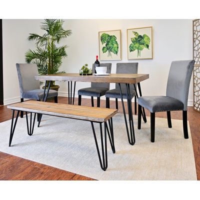 Dining Table Set, 6-Piece Dining Table Set, Wood Top Table With 4 Chairs And 1 BenchBring distinctive style to your living space with the Dining Table Set. The set includes a spacious dining table and comfortable chairs, providing ample seating for family and guests. The tabletop is constructed with durable manufactured wood, ensuring long-lasting durability. Complementing the table are stylish chairsLark Manor