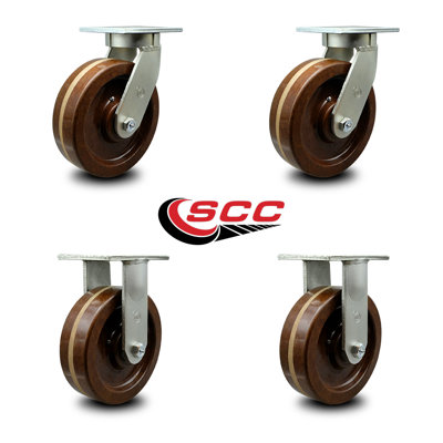 Heavy Duty High Temp Phenolic Wheel Caster Set 2 Swivel 2 Rigid Set of 4Listing is for a set of four (4) Service Caster Series #92 casters with 8" diameter, 3" wide brown high temperature phenolic wheels. Set includes two (2) swivel casters and two (2) rigid casters. Supports 10000 total pounds (lbs) at 2500 pounds (lbs) per caster. Service CasterService Caster
