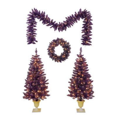 ? Christmas Decoration ?Pre-Lit Christmas Artificial Tree 4-Piece Set, Garland, Wreath And Set Of 2 Entrance Trees, X-Mas With LED Lights, PVC FestivaOur 4-piece Christmas tree features 840 branch tips and 330 colorful lights. 4ft entrance tree has 260 branch tips and 100 warm white lights, Christmas wreath has 120 branch tips and 40 warm white lights, Christmas rattan has 200 branch tips and 90 warm white lights. Red Barrel StudioRed Barrel Studio