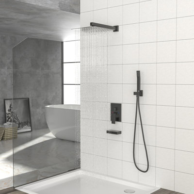 Shower System - Waterfall Tub Spout Shower Faucet Set With 12 Inch Rain Shower Head Wall Mounted Shower Set With Contain Rough-In Valve Body And Trimshower system included 12" rain showerhead, 14" shower arm, Waterfall Tub Spout Shower Faucet, Handshower, Pressure Balance Valve with Brass body.High quality and design, let you experience an unprecedented bath time. cheetah sourcing Finish: Blackcheetah sourcing