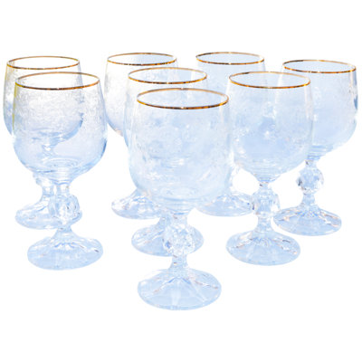 8 - Piece 12oz. Crystal All Purpose Wine Glass StemwareSet of eight midcentury crystal wineglasses with etched patterns and gilded rims. The Moroccan RoomThe Moroccan Room
