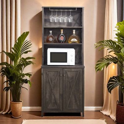 Farmhouse Style Pantry Cabinet With Rustic Microwave Stand, Stemware Hanger And Hollow Out Barn Design, Charcoal GreyElevate your home decor with our Farmhouse Style Pantry Cabinet - a charming and functional addition to any space. With its rustic microwave stand featuring a hollow out barn design, this cabinet effortlessly combines style and functionality.The Barn X-tape Design not only adds visual interest but also allows for easyWilliston Forge