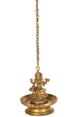 Lamp Of Wisdom (Goddess Saraswati Hanging Lamp)Goddess Parvati here stands at ease in the triple bent posture on a square lotus base. The left arm extends in lolahasta, whereas the right is bent at the elbow with the hand displaying the katakamukha gesture, intended to hold a flower. The goddess is depicted with a narrow waist, smooth flat stomach and a long dhotiExotic India