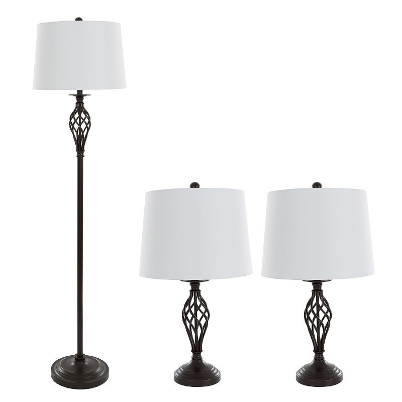 Portsmouth Home Spiral Table Lamp & Floor Lamp 3-piece Set, BlackBrighten your home with sophistication and elegance with this Portsmouth Home table lamp and floor lamp set. Spiral base design Cream drum shade WHAT'S INCLUDED Two table lamps: 24.5''H x 14''W x 6''D (each) Floor lamp: 60''H x 15''W x 10''D Table lamp weight: 3.48 lbs. Floor lamp weight: 8.45 lbs. Base: metal Shade: cPortsmouth Home