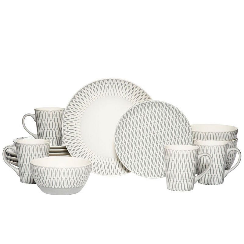Gourmet Basics Aurora 16-pc. Dinnerware Set, GrayAdd just the right amount of style to your tabletop with this chic Gourmet Basics dinnerware set.PRODUCT FEATURES Geometric grid pattern creates an eye-catching appeal. Stoneware reactive glaze ensures long-lasting beauty. WHAT'S INCLUDED Four 10.5-in. dinner plates Four 8.4-in. salad plates Four 6-in. soup/cereal bowlGourmet Basics