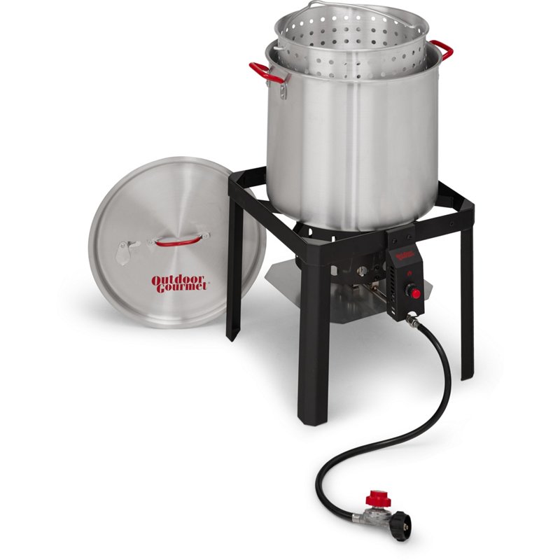 Outdoor Gourmet 60 qt Boiling Kit Black - Gas GrillsCreate a flavorful seafood boil with the Outdoor Gourmet 60 qt Boiling Kit. The aluminum pot, basket and lid offer long-lasting use, and the steel burner stand with dual stainless-steel jet burners provides resistance to wear and tear. The hanging hook allows you to hold the pot up in any outdoor area, and the integratOutdoor Gourmet