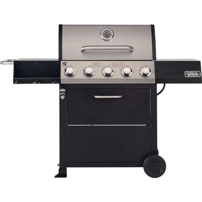 Outdoor Gourmet Classic 5-Burner Gas Grill Black - Gas GrillsGet ready to grill up some delicious meals on the Outdoor Gourmet Classic 5-Burner Gas Grill. The cast-iron grates offer 513 square inches of cooking surface, perfect for big family meals and parties, and there are 2 side tables for prepping meals. A storage area keeps spices at the ready, and a set of easy-roll wheelsOutdoor Gourmet