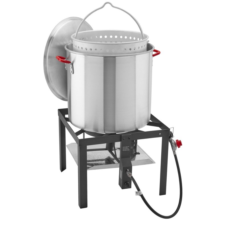 Outdoor Gourmet 100 qt Boiling Kit Silver - Pots / PansSatisfy your high-capacity boiling needs with the Outdoor Gourmet 100 qt Boiling Kit. This steel burner stand accepts liquid propane to output 100,000 BTUs and heat liquids quickly. The included aluminum pot fits up to 80 quarts and features silicone-wrapped handles for safety and secure handling, great for crawfish seOutdoor Gourmet