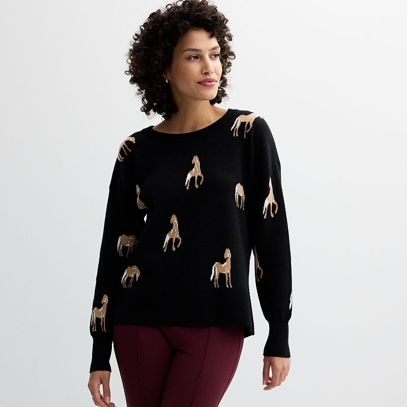 Women's Catherine Malandrino Horse Crewneck Sweater, Size: Medium, Black And CamelStep into style with this Women's Catherine Malandrino Horse Crewneck Sweater.Click on this WOMEN'S GUIDE to find the perfect fit and more! Step into style with this Women's Catherine Malandrino Horse Crewneck Sweater. Click on this WOMEN'S GUIDE to find the perfect fit and more! FEATURES Drop-shoulder sleeves Long sleCatherine Malandrino