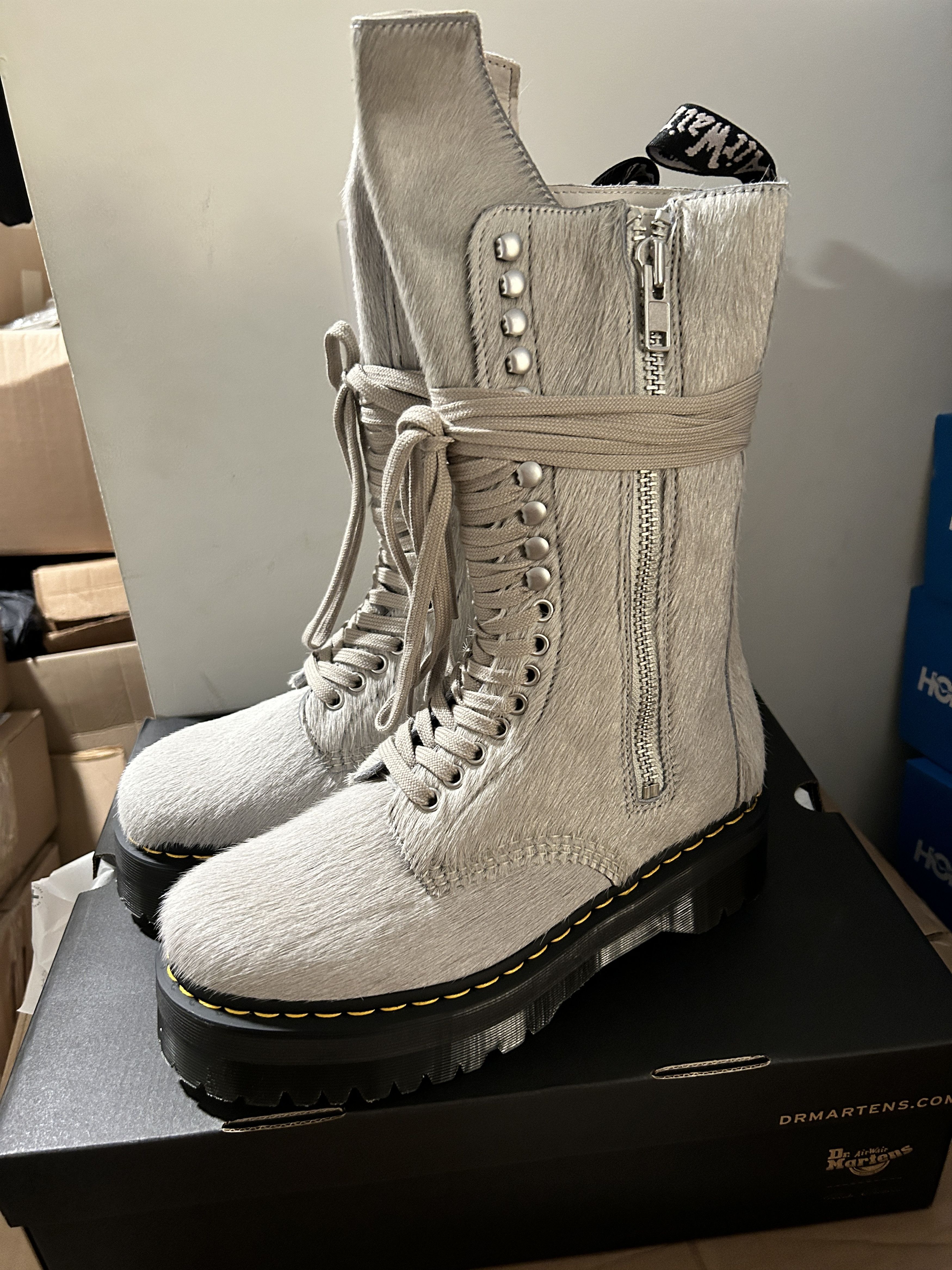 Dr Martens x Rick Owens 1918 Ro Hair On Lace Up Strobe Calf Length Platform Boot in Beige (Size 10)Dr. Martens 1918 Ro Hair On Lace Up Strobe Calf Length Platform Boot Rick Owens Rick Owens’ Meteoric Rise In The 90S Coincided With A Grunge Renaissance For Dr. Martens: A Decade Defined By Deconstructed, Binary-Defying Wardrobes And Attitudes. And This Spirit Of Energetic Non-Conformity Drives Our Latest CollaborationDr Martens x Rick Owens